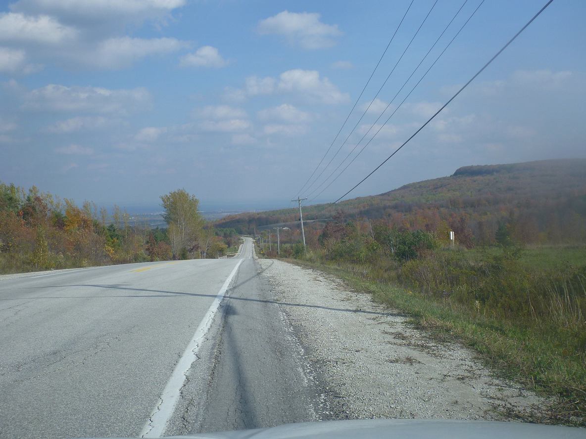 October, 2012 I drove up the Niagara Escarpment just after Thanksgiving to see leaves again. Once I got to Hwy 89, I got to the Bruce trail, then went back & forth on the back roads to cross it at every road. Did this all the way up to Collingwood. Found some new roads, but also some of my favourite roads there too. Had a one hour hike at Nottawasaga Bluffs too. |
